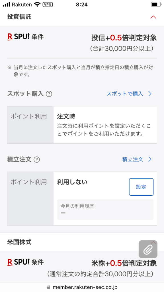 この設定をしておくと、毎月の積立注文時に自動的にポイントが使われます。楽天証券
